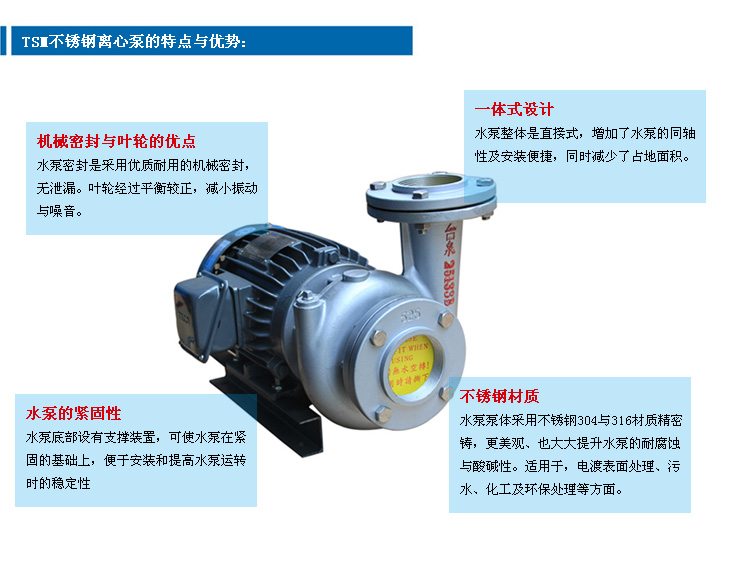 臺泉不銹鋼離心泵,泵體采用304、316精密鑄造成型,無砂孔問題。電機與泵體是一體形同軸設計,不僅僅保證了電機的穩固性,而且水泵占地面積小與噪音小的性能。水泵廣泛使用于電渡、涂裝、化工、PCB線路板、環保設備等方面。