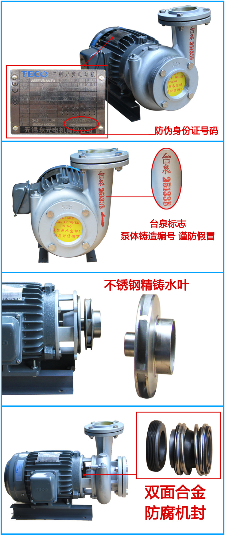 臺泉水泵不管是在研發還是生產都有這成熟完善系統,所有產品都原裝產品保障金。并且不管是零配件還是成品都嚴格質控,保障了每臺水泵的質量,讓客戶使用的更加放心。買好泵,選臺泉。
