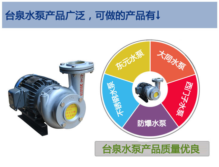 我司的臺泉水泵是及研發、生產、銷售、售后、一條龍的服務,杜絕了多個中間商的加價供貨現象,有效的控制了水泵的成本,把利益都讓給了廣大客戶,保障了客戶能享受到更實惠更合理的價格。