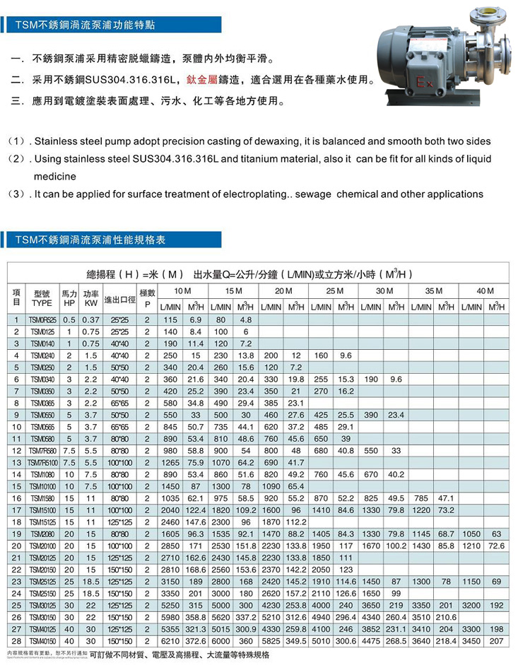 采用不銹鋼304/316精鑄而成,具有耐酸堿,耐高溫,耐磨等特點,應(yīng)用于電鍍,涂裝,環(huán)保,化工等領(lǐng)域,又名污水泵,耐酸堿泵.可訂做防爆泵,二級能效泵,特殊電壓泵.